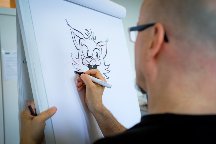 „Dino“, der Erfahrung mit sämtlichen Werbeprojekten hat, gestaltete für die Schüler*innen des SMART-Zweiges einen Illustrations-Workshop. Nach einer Einführung zum Thema Comic-Kunst stellte Dino den Schüler*innen einen konkreten Arbeitsauftrag: Ein Katzensymbol sollte zunächst zu planen, dann zu skizzieren und schließlich zu kolorieren sein.