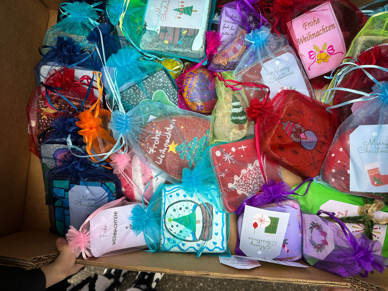 Gemeinsam mit Professorin Barbara Raunegger wurden Sterne gebastelt, Steine liebevoll bemalt und Weihnachtskärtchen gestaltet. Alles wurde anschließend sorgfältig mit dem Ziel verpackt, anderen eine Freude zu machen.
