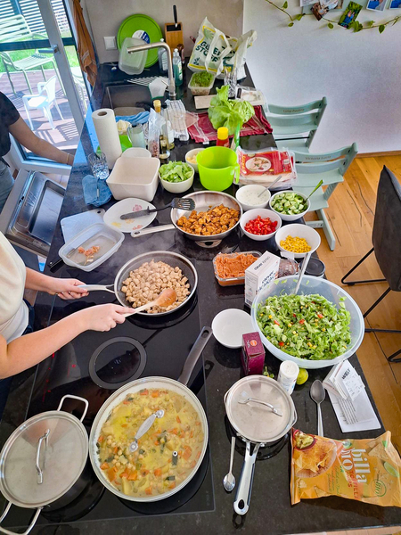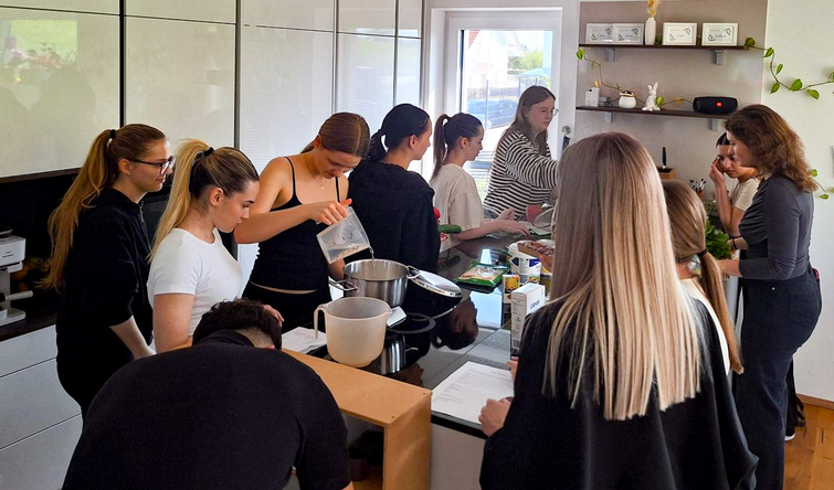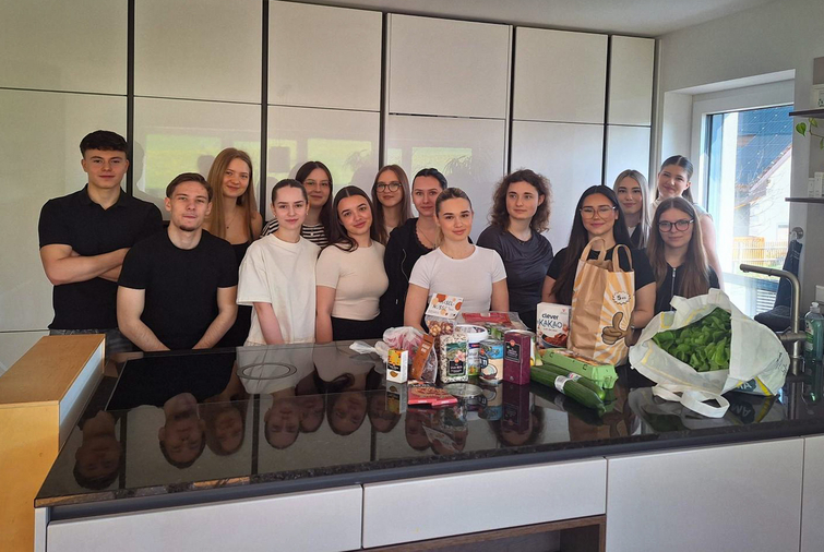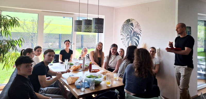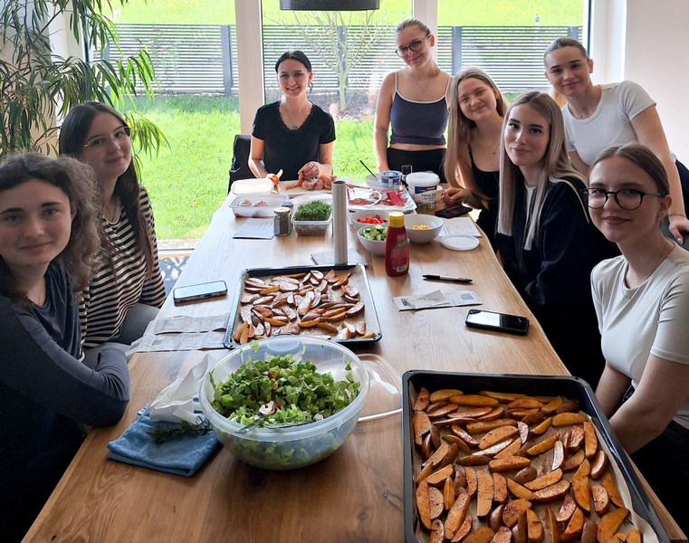 Der kulinarische Höhepunkt des Tages folgte im Anschluss bei Frau Prof. Brandner, die die Klasse freundlicherweise zu sich nach Hause einlud. Gemeinsam mit ihr und Prof. Huber bereitete die Klasse aus den eingekauften Zutaten köstliche Gerichte zu. Neben dem gemeinsamen Kochen standen vor allem Teamarbeit, Kreativität und der bewusste Umgang mit Lebensmitteln im Mittelpunkt.