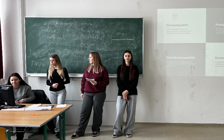 Zurück in der Schule präsentierten Amely, Lucia, Melanie und Lisa das Thema Marketing. Anschließend setzten die Schülerinnen der 2AS die „4 Ps“ – Produkt, Preis, Platzierung und Promotion – anhand ihrer eigenen Produkte praxisnah um.