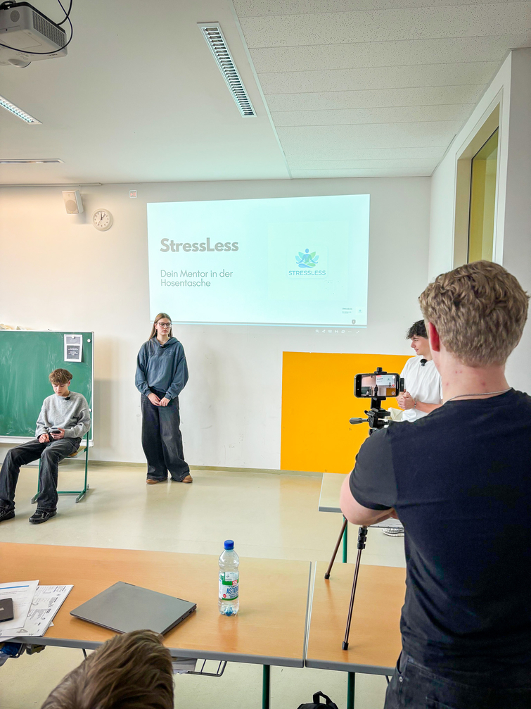 Ein besonderes Highlight war das anschließende Pitchen der Geschäftsideen. Die Schüler präsentierten ihre Konzepte in kurzen Präsentationen, wie es auch in der realen Startup-Welt üblich ist.
